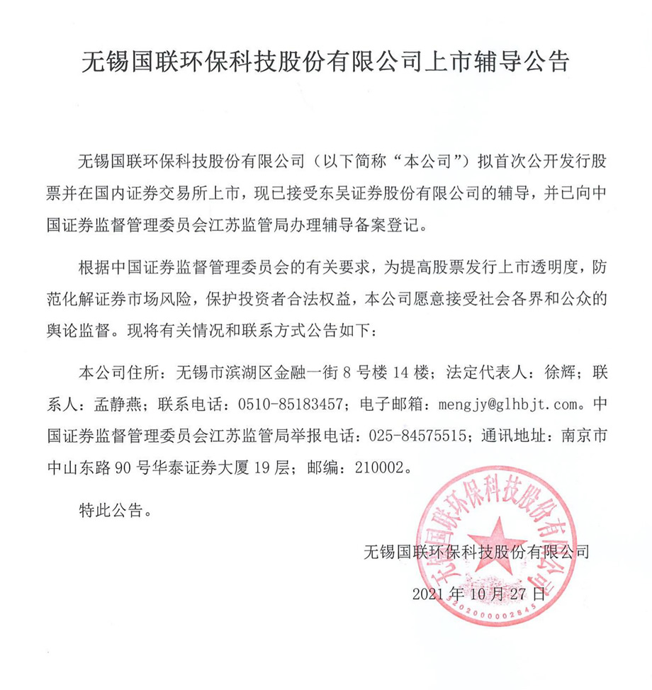 無錫國聯(lián)環(huán)保科技股份有限公司上市輔導(dǎo)公告